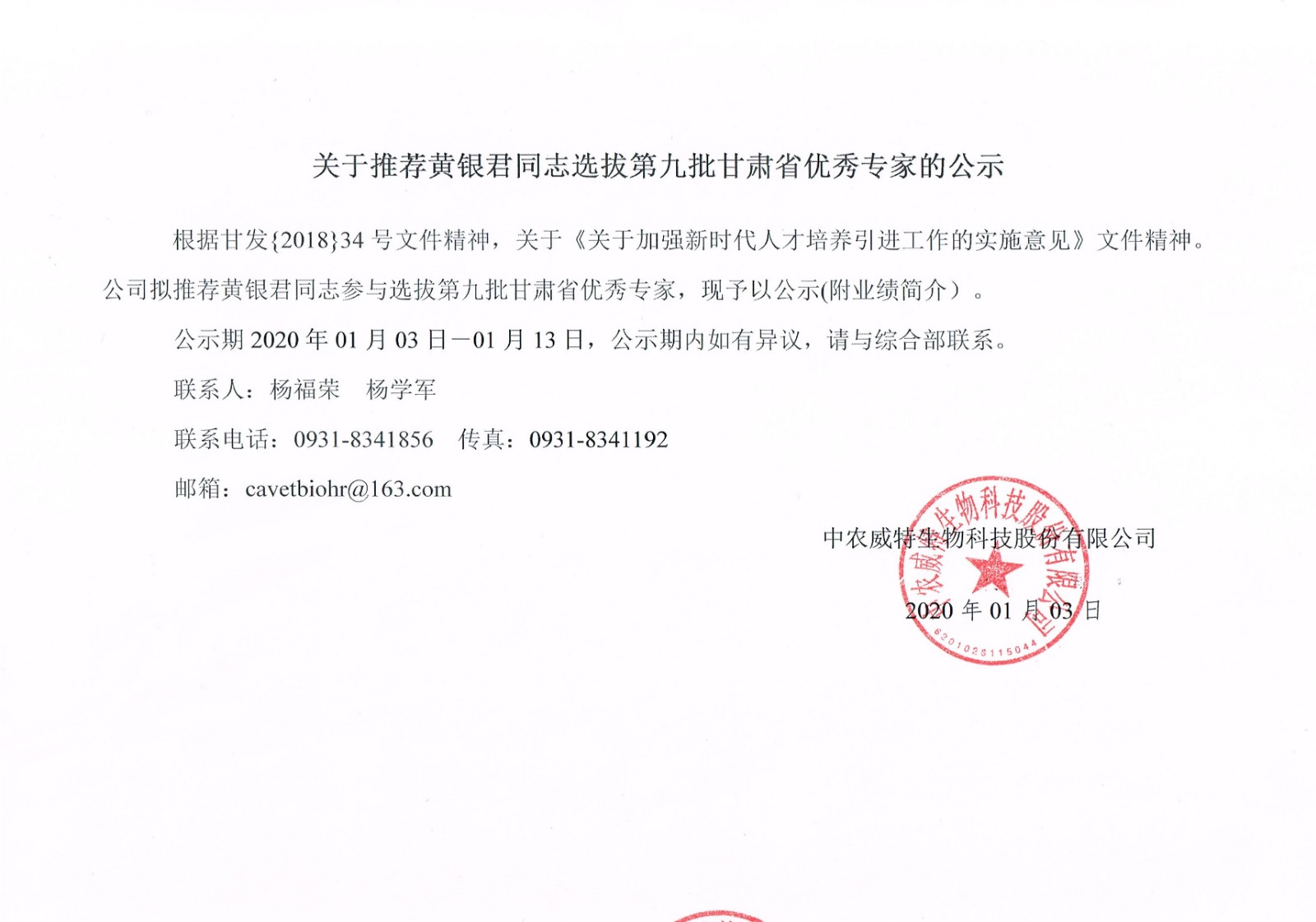 关于推荐黄银君同志选拔第九批甘肃省优秀专家的公示