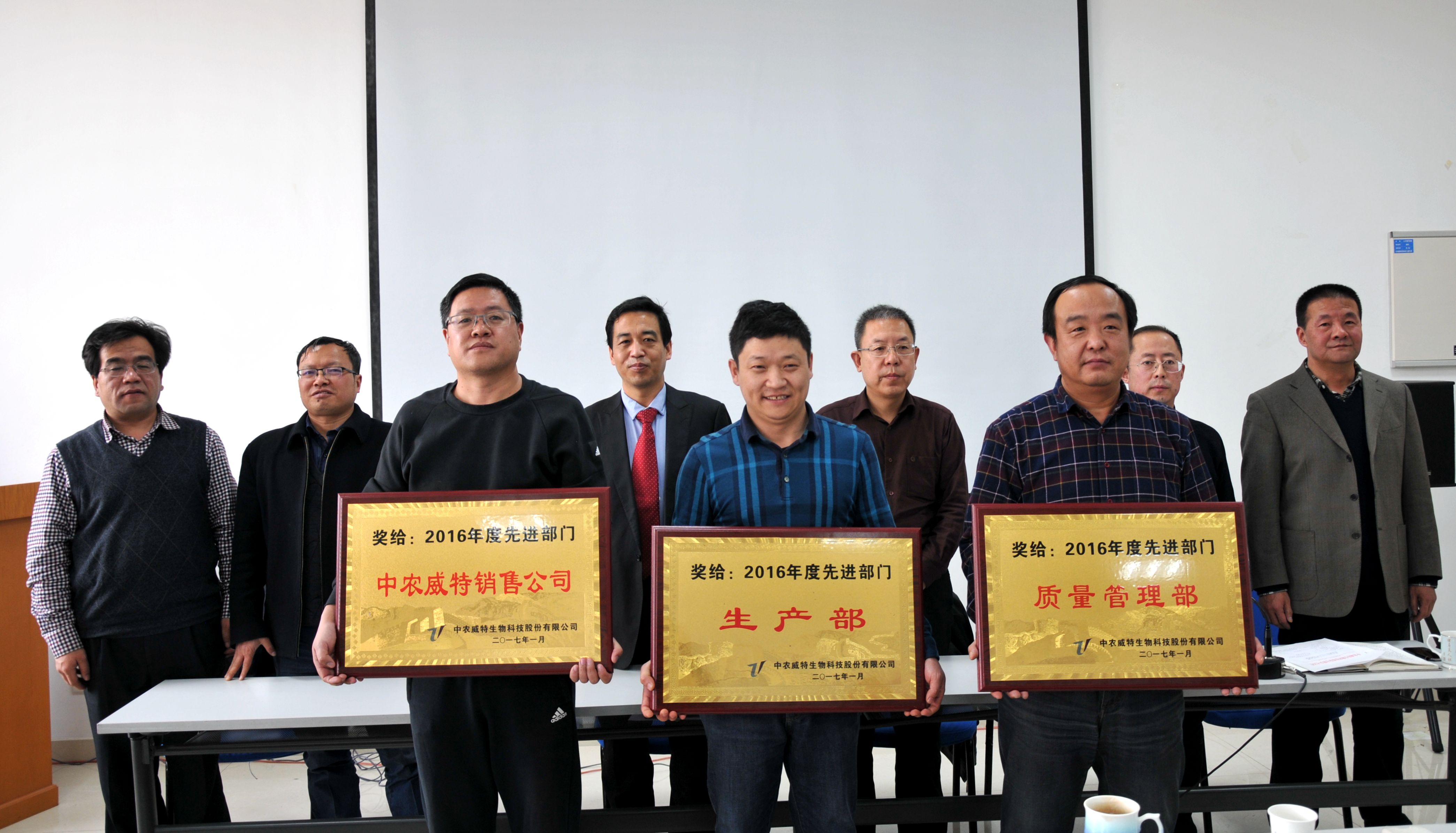 第四项,由王超英副总经理宣读了《关于表彰和奖励2016年度先进集体和先进个人的决定》,中农威特销售公司等3个部门、生产部一车间悬浮培养线细胞病毒生产班等8个班组荣获先进集体,刘西兰等58名个人荣获先进个人荣誉。殷宏所长和公司经营管理层一同为获得先进的集体和个人颁发奖牌和荣誉证书并合影,按《决定》分别给予先进集体和先进个人一定数额的现金奖励,以资鼓励。