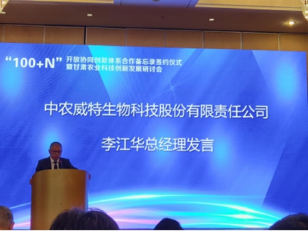 5月21日,由科技部中国农村技术开发中心(简称“科技部农村中心”)和甘肃省科学技术厅(简称“甘肃省科技厅”)共同主办的“100+N”开放协同创新体系合作备忘录签约会议暨甘肃农业科技创新发展研讨会在兰州隆重举行。甘肃省人民政府副省长张世珍、科技部农村中心主任邓小明出席会议并讲话。会议由甘肃省科技厅党组书记、厅长张世荣主持。李江华总经理参加会议,代表中农威特公司签约并交流发言。